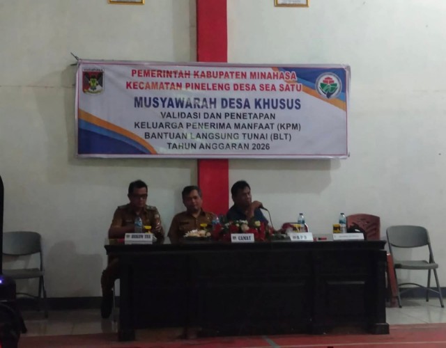 MINAHASA – Pemerintah Desa Sea Satu sukses menyelenggarakan Musyawarah Desa Khusus (Musdesus) dalam rangka validasi dan penetapan Keluarga Penerima Manfaat (KPM) Bantuan Langsung Tunai (BLT) Dana Desa untuk Tahun Anggaran 2026. Kegiatan yang berlangsung pada Selasa (27/1/2026) ini bertempat di Aula Desa Sea Satu.